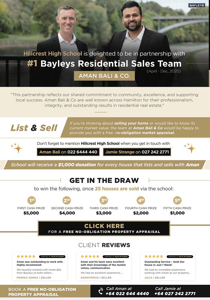 When you choose to list and sell your property with Aman and Jamie anywhere in the Waikato region, Hillcrest High School will receive a $1,000 donation to support student opportunities, learning, and wellbeing.