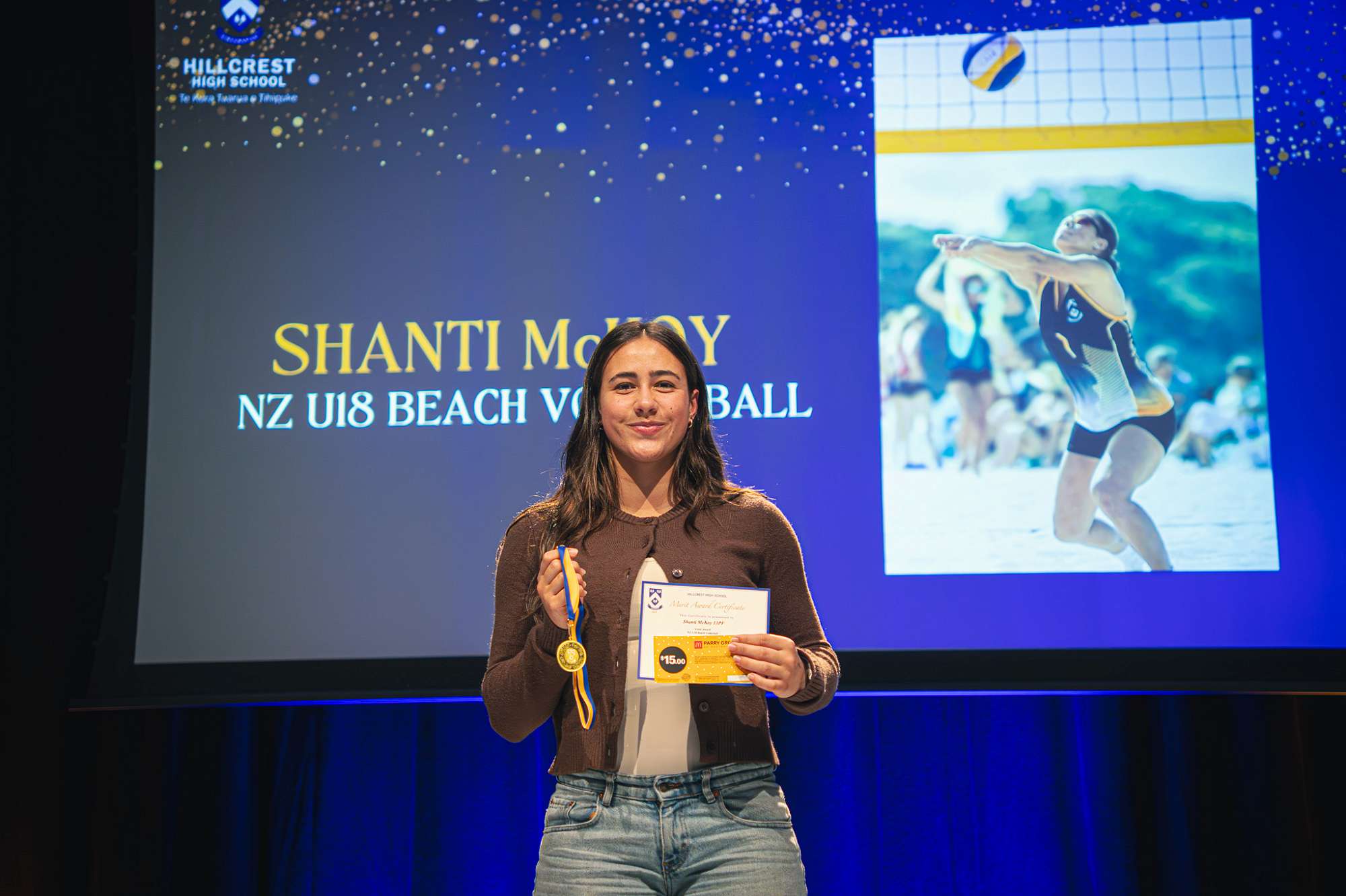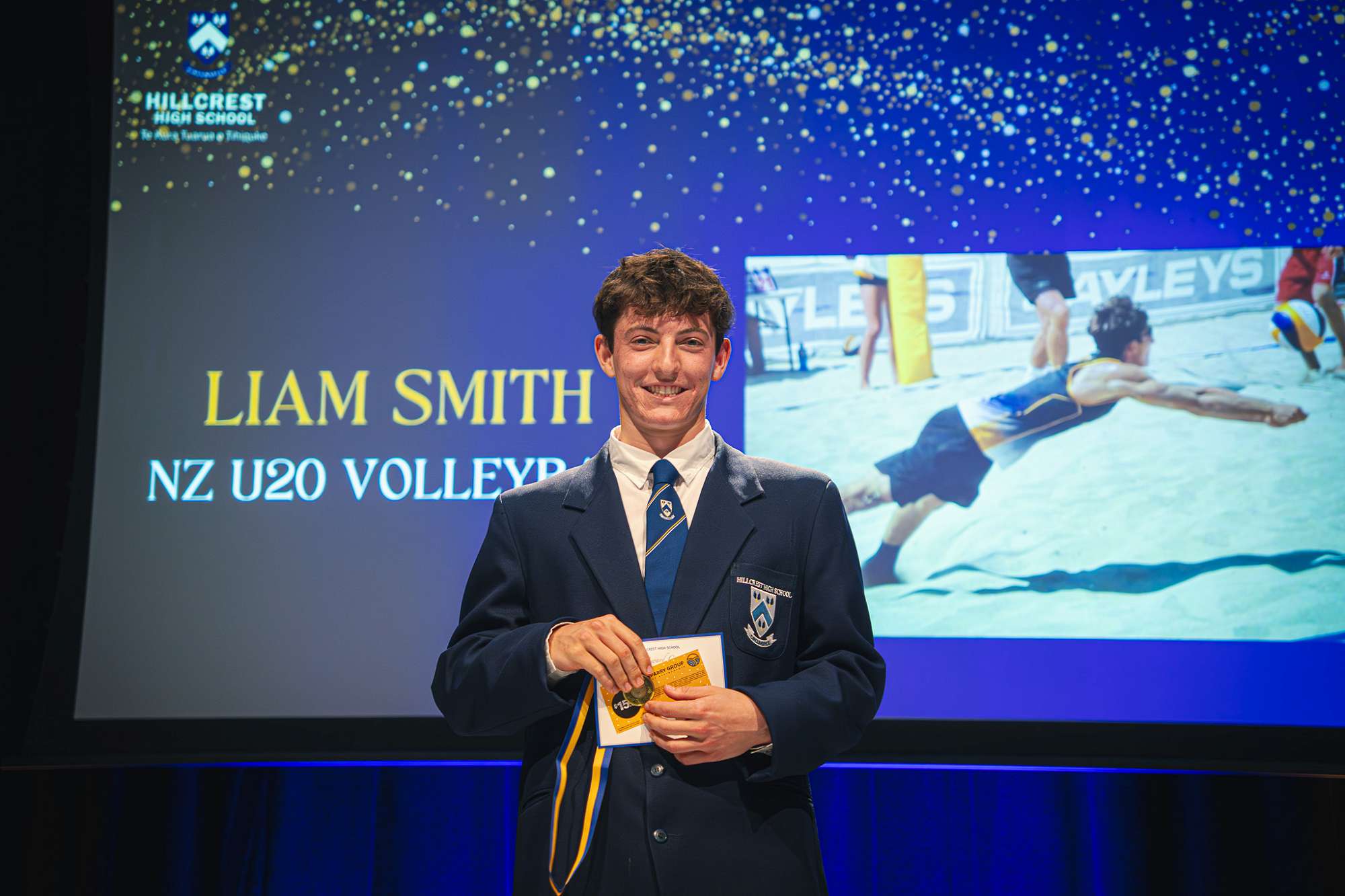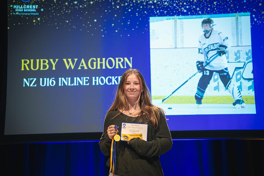 The newly added Crest Award recognized students selected for full NZ age group or open teams: Liam Smith (NZ U20 Volleyball), Bjorn Fitch (NZ U20 Volleyball), Shanti McKoy (NZ U18 Beach Volleyball), and Ruby Waghorn (NZ U16 Inline Hockey).