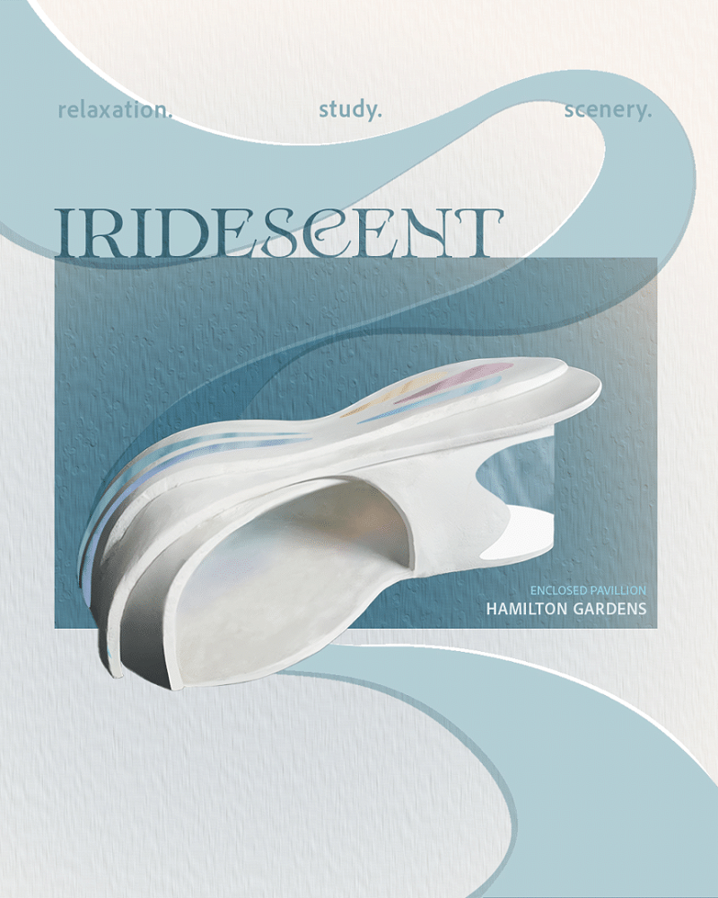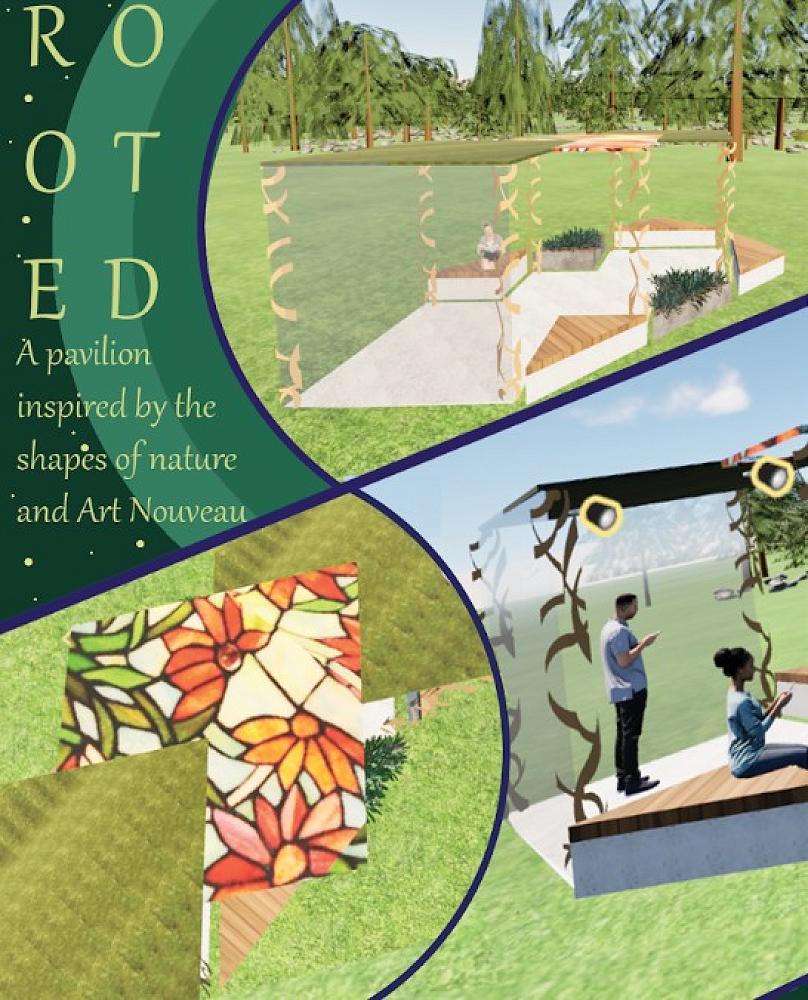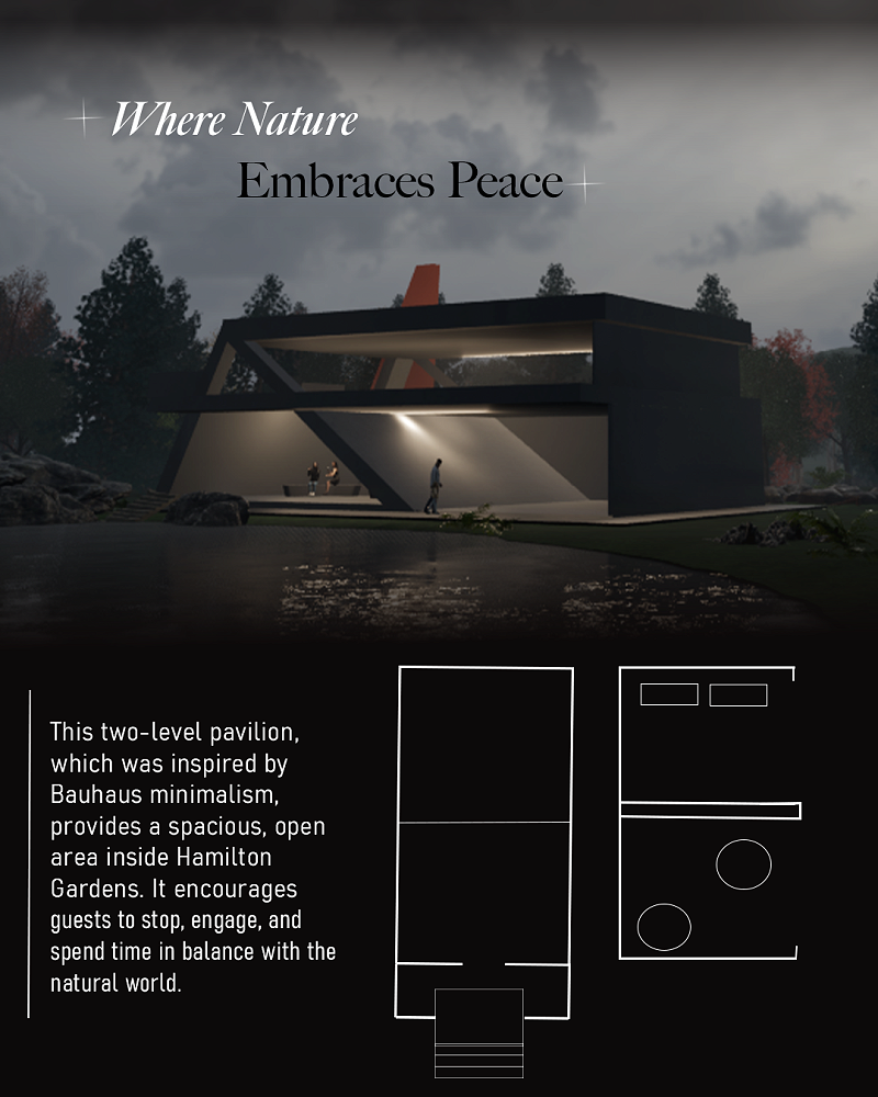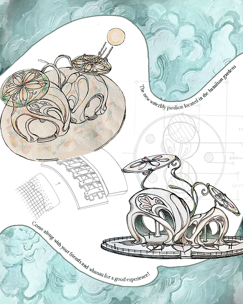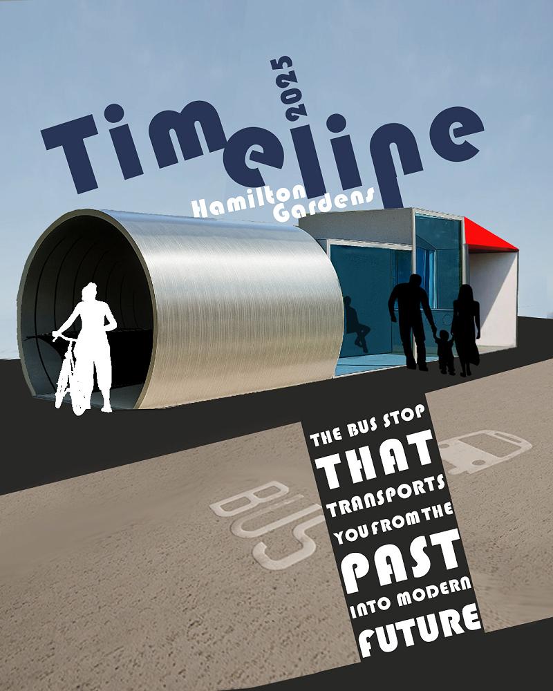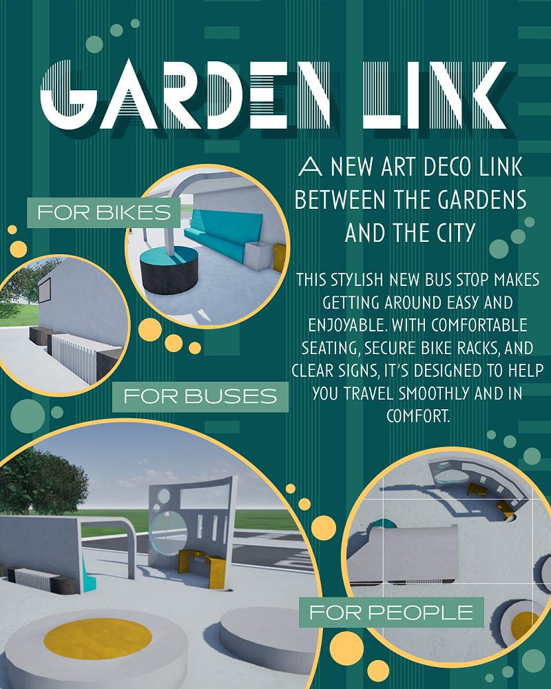 They were tasked with designing a Bus Shelter or Pavilion for the Hamilton Gardens, inspired by a key design movement like Art Nouveau, Deconstructivism, Bauhaus, or Art Deco. These posters are the final promotional pieces for their designs.