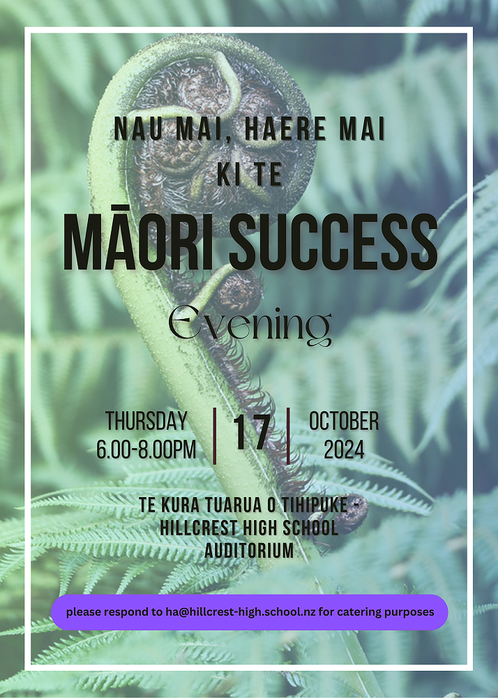 Māori Success Evening will be taking place in the school auditorium from 6.00pm on the 17th of October. There is a tight turnaround for the awards, but we will aim to notify you if your child is being recognised as early as possible.