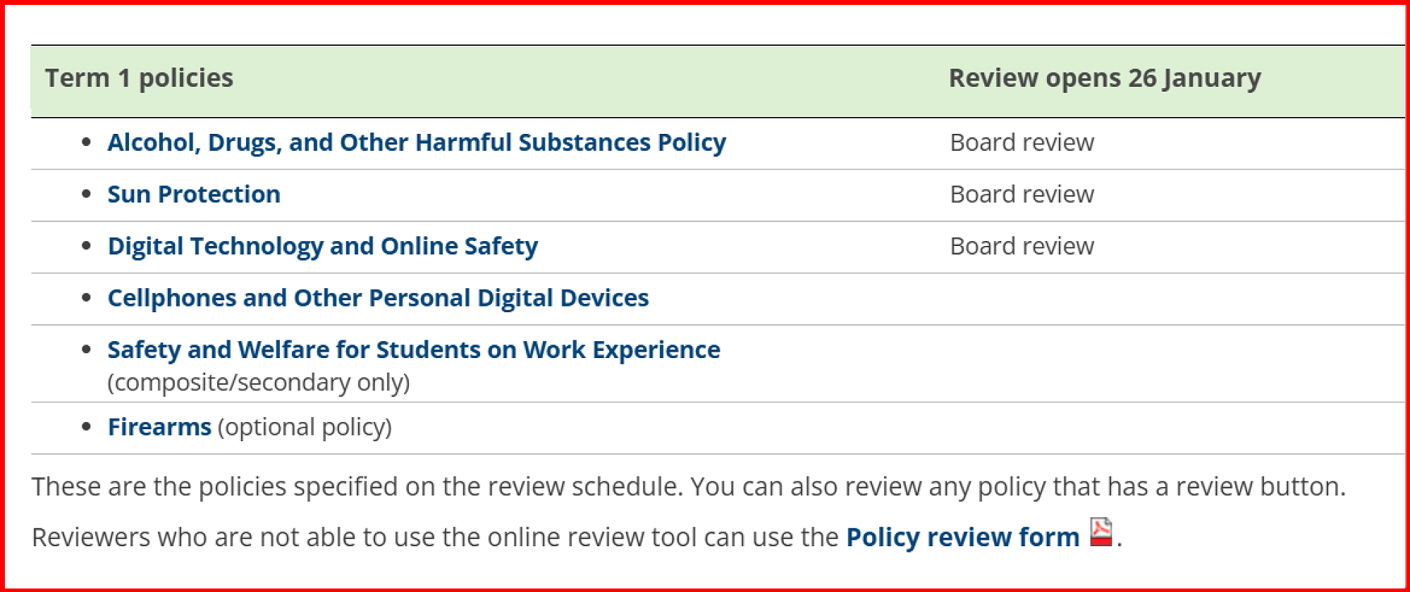 Each term there are policies up for review on Schooldocs. Should you wish to be part of the review go to the Schooldocs site under Our School – Our Community – Our Board on our website.